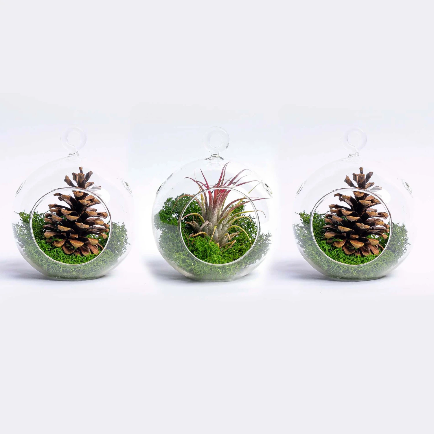 Are you looking for a unique and stylish way to bring greenery into your home? This set of glass ball hangers is a perfect choice! Made of clear glass and featuring an opening at the front, this hanger provides the ideal space for a decorative arrangement. Complete with a Tillandsia air plant and a soft bed of moss, you can effortlessly create a natural and elegant piece of art that fits any room. The two small holes at the top ensure proper air circulation, making it perfect for maintaining the air plant.